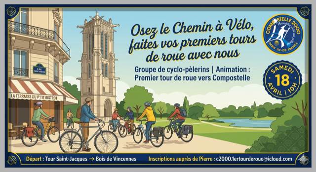 Vous vous posez des questions sur l’itinéraire, sur le chargement et l’équipements du vélo…. Compostelle 2000 vous propose de rejoindre Pierre qui répondra à vos différentes questions et vous permettra de faire vos » premiers tours de roues » sur le Chemin.